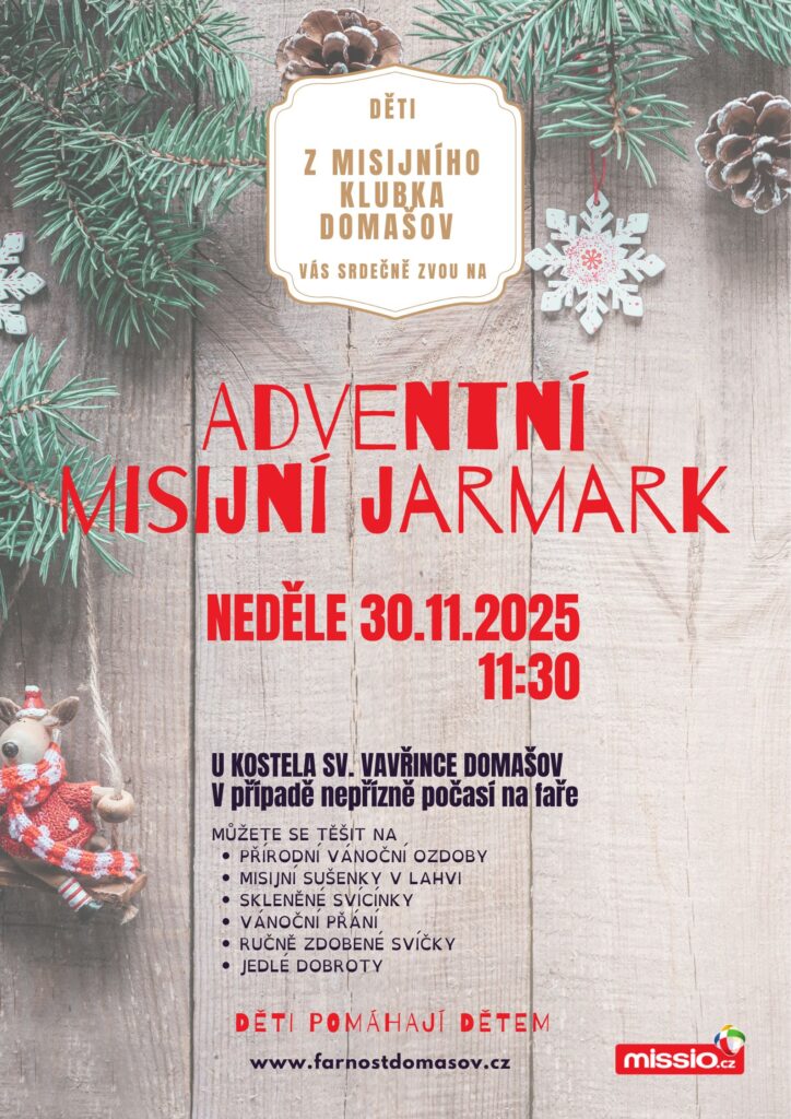 Přijďte si první adventní neděli 30.11.2025 po mši svaté 11:30 koupit výrobky dětí Misijního klubka z Domašova. Jarmark proběhne před kostelem, v případě nepřízně počasí bychom byli na faře.
