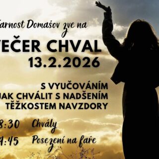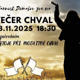 Srdečně Vás zveme opět na večer chval v Domašově v kostele svatého Vavřince v pátek 28.11. v 18:30. Během modlitby proběhne vyučování o postojích při modlitbě chval a dozvíme se více o používání vlajek při modlitbě chval.