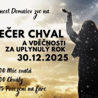 Srdečně vás zveme ve společenství naší farnosti stát před naším Bohem ve chvále i ve vděčnosti za všechno, čím nás obdaroval v upynulém Jubilejním roce 2025 i za to, že je Immanuel, Bůh s námi. Sejdeme se v 17:00 ke mši svaté, po ní budou následovat chvály s možností hlídání dětí a následně se přesuneme na faru k vzájemnému sdílení...